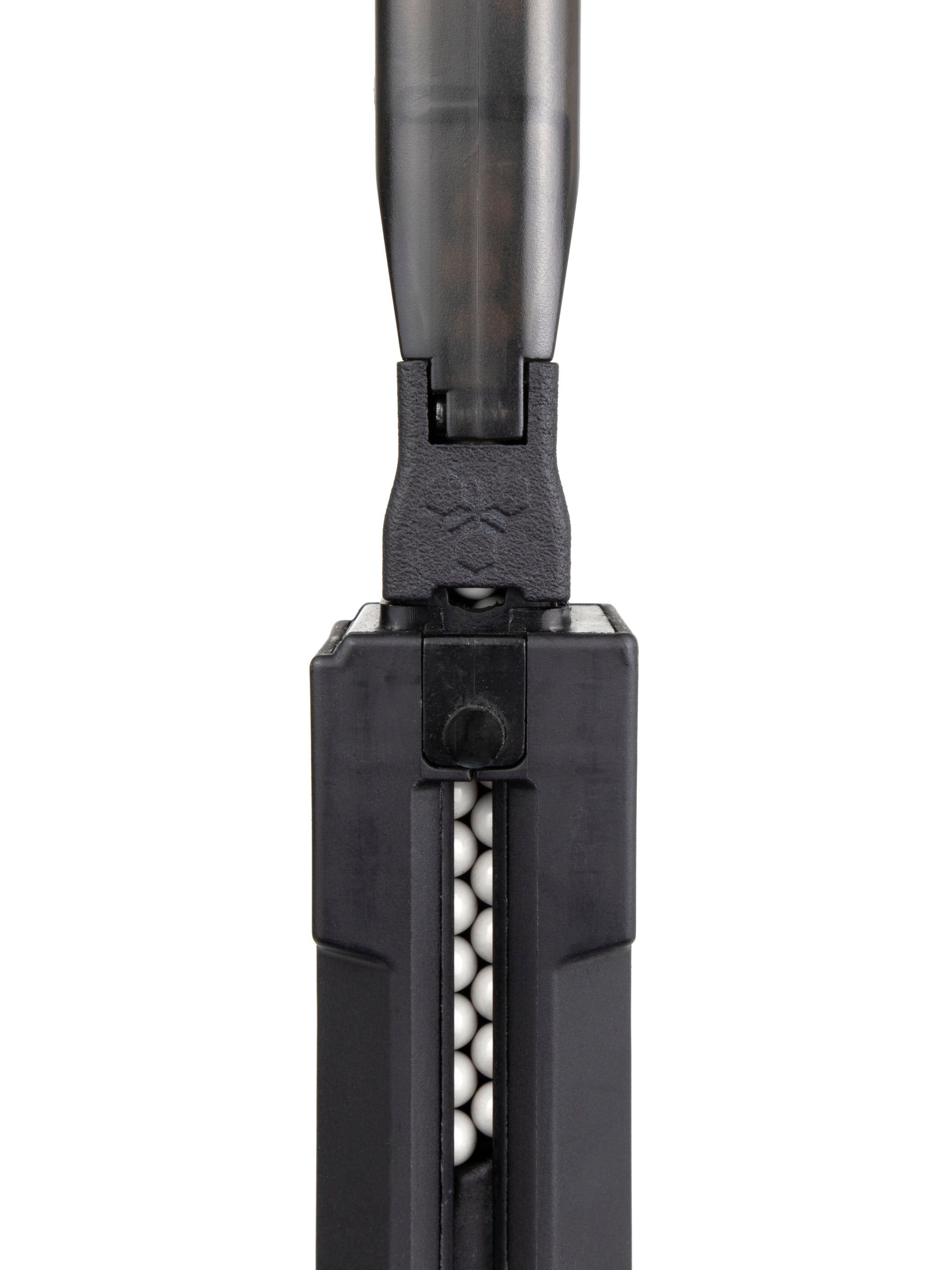 Attaches directly to most standard size speedloaders on the market and has a BB retention mechanism. We recommend removing original O-ring from the speedloader tip - they usually fall out anyways and can cause a jam.