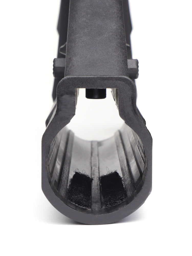 Stock comes with pre-cut velcro strips (made by us) to reduce the wobble as it was literally impossible to find a buffer tube and stock combination that has a perfect fit.