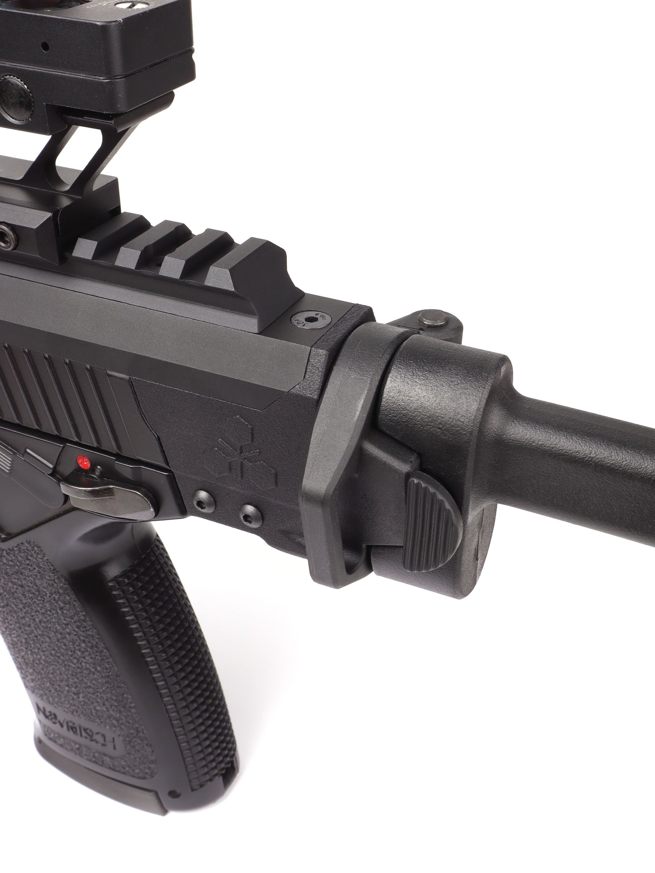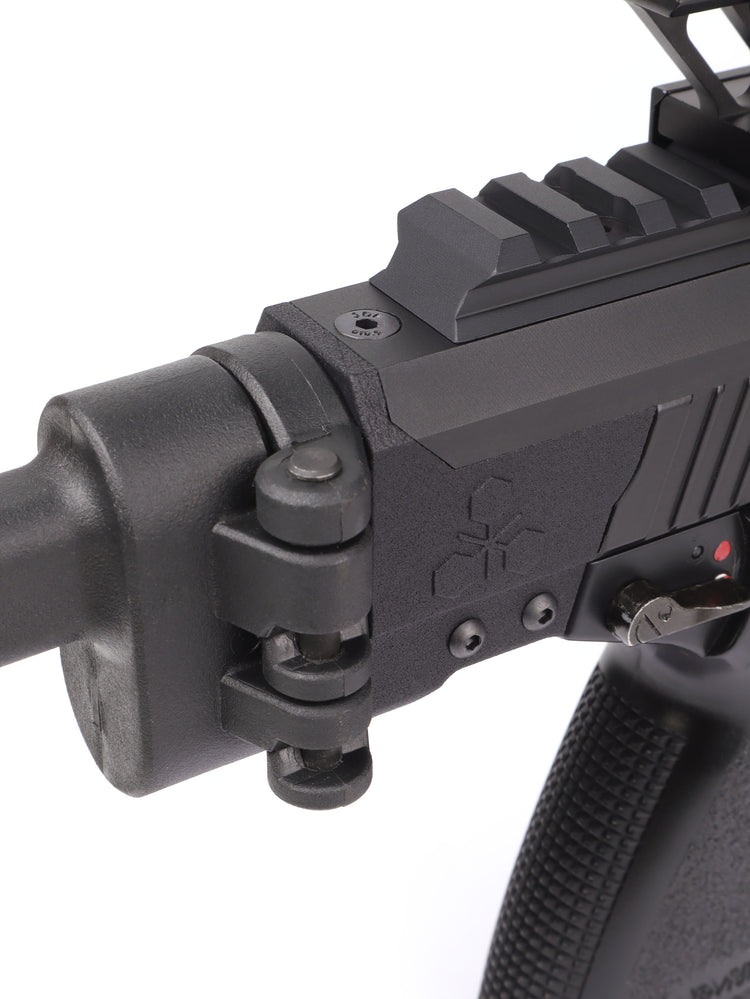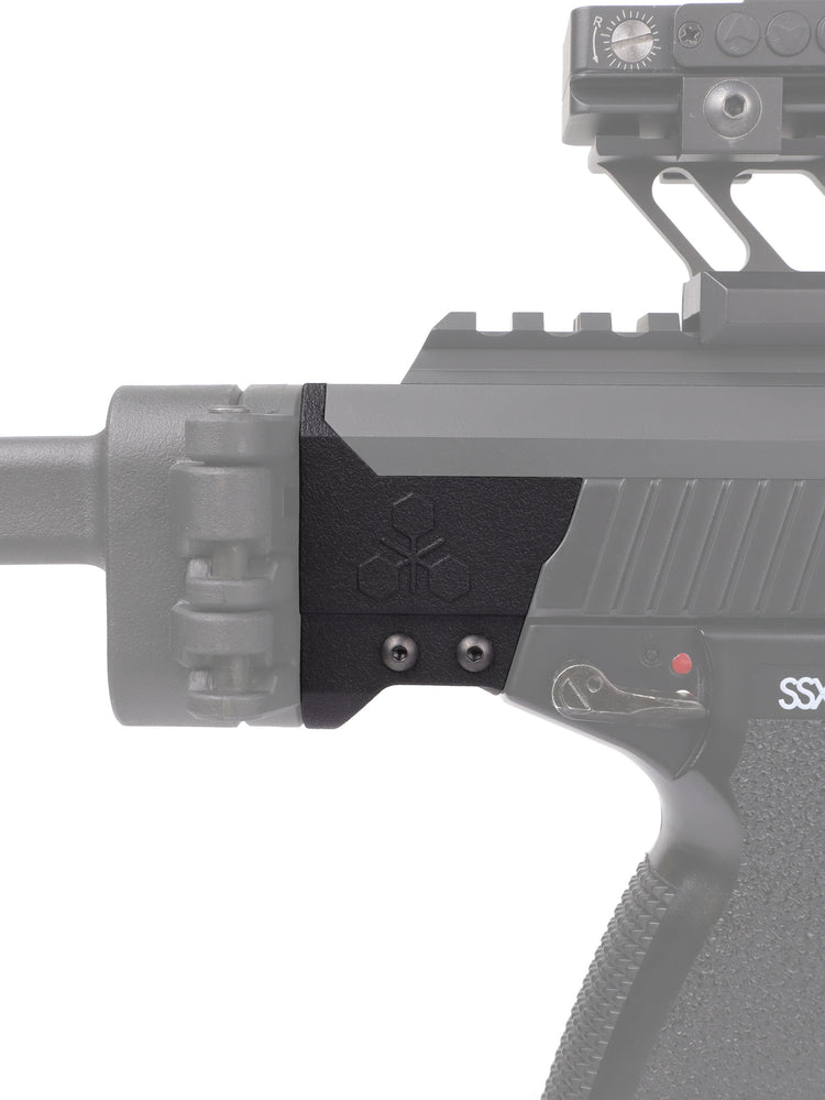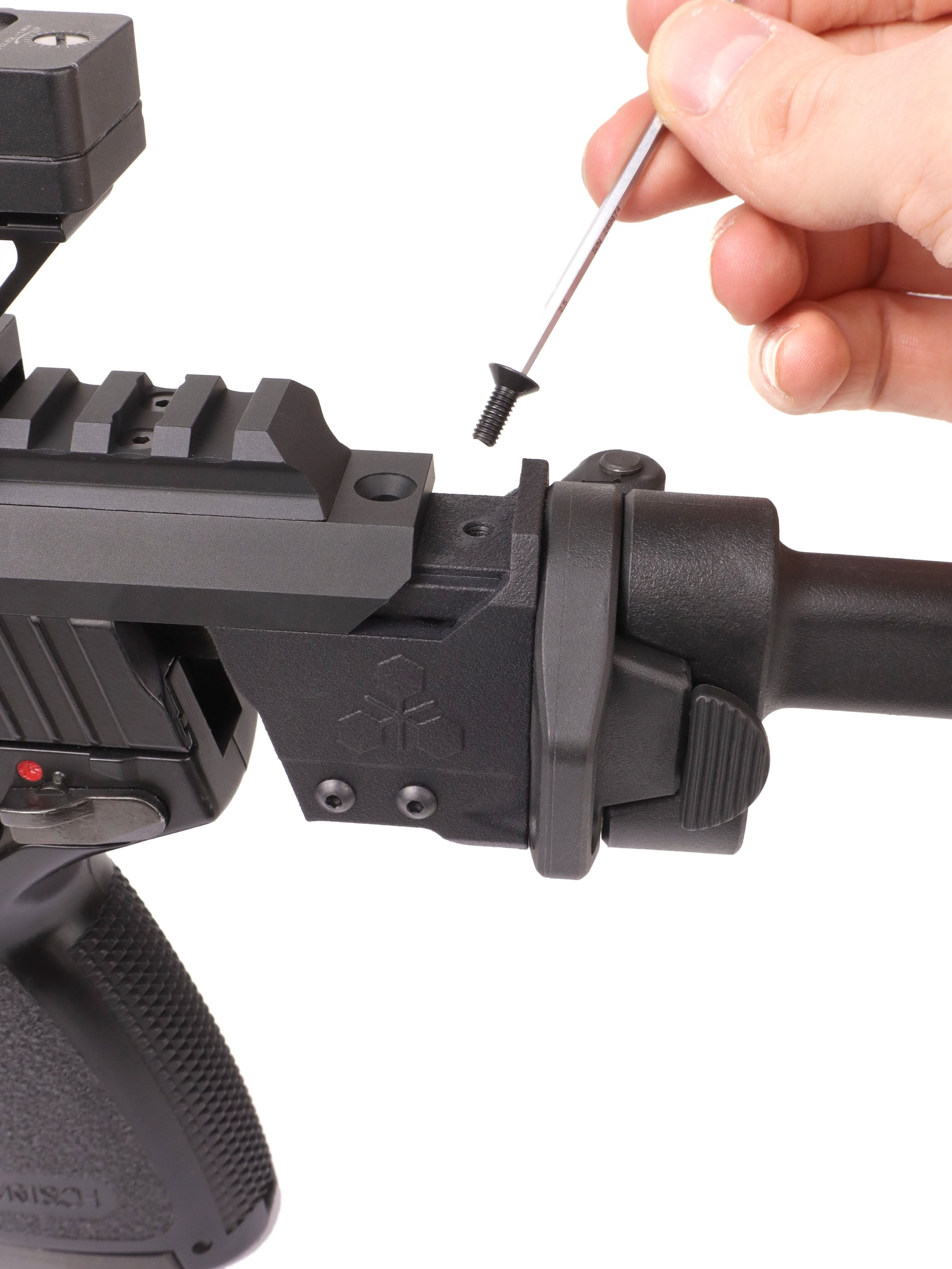 This is an adapter piece which allows to mount the ARES Folding Stock to the Nano Carbine. It slides into the Core Mount and is fixed in place with a single screw.