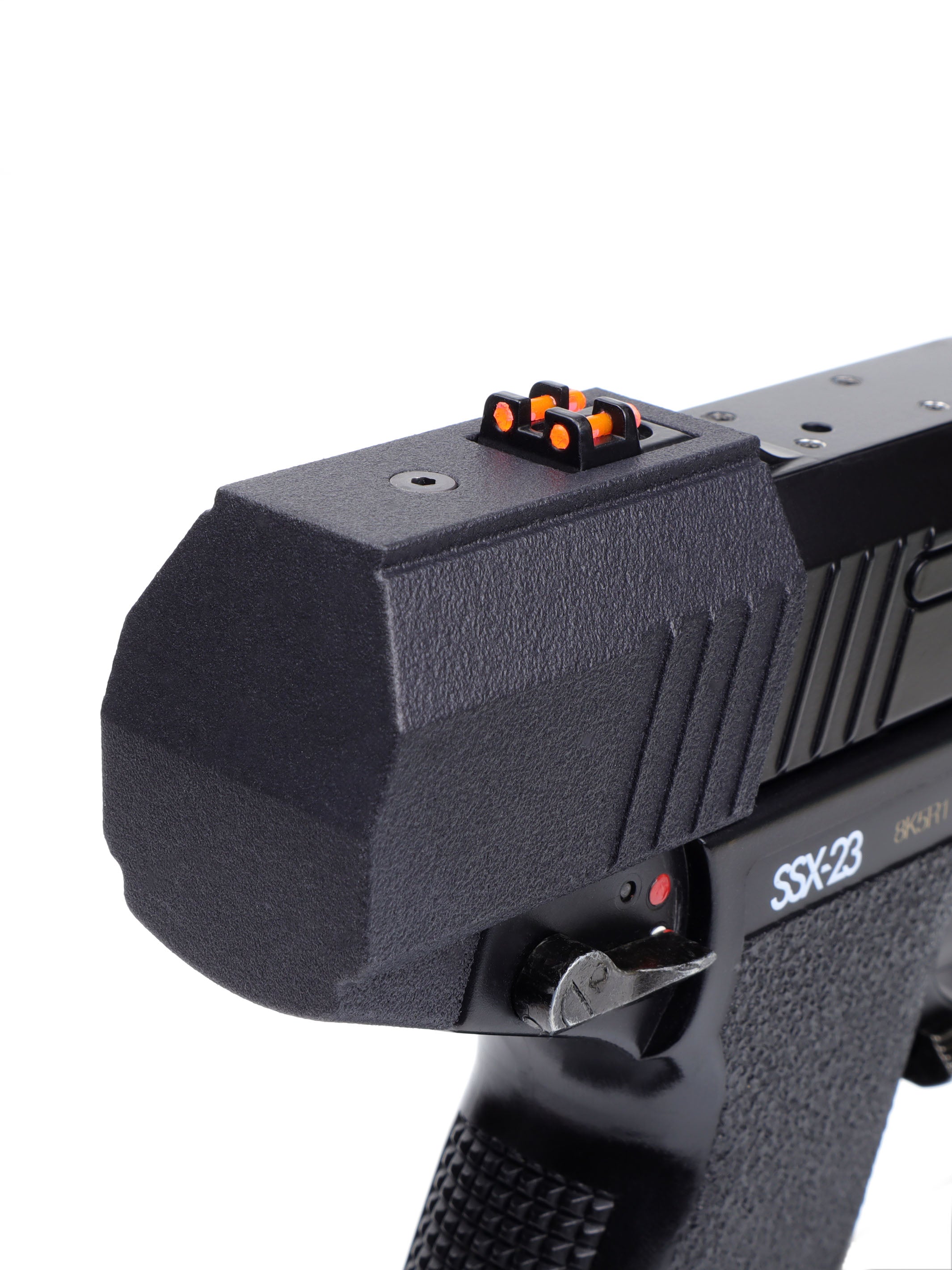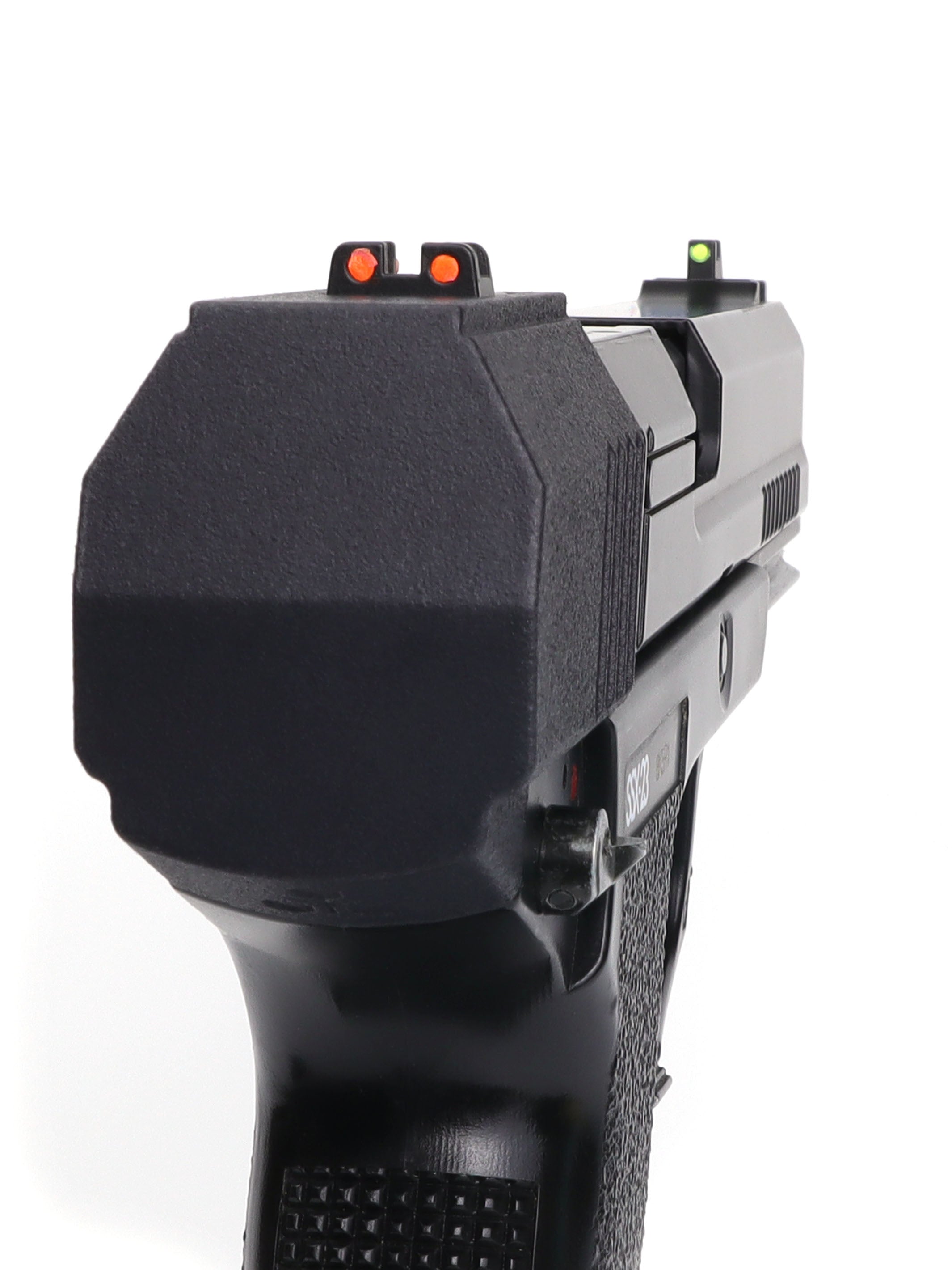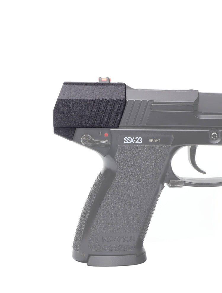 With some small modifications, the hammer cover is also compatible with the SSX23 Picatinny Slide Rail and can be used with the red dot. There are pre-made cutting path made on the front of the cover that needs to be cut away to make space for the rail.