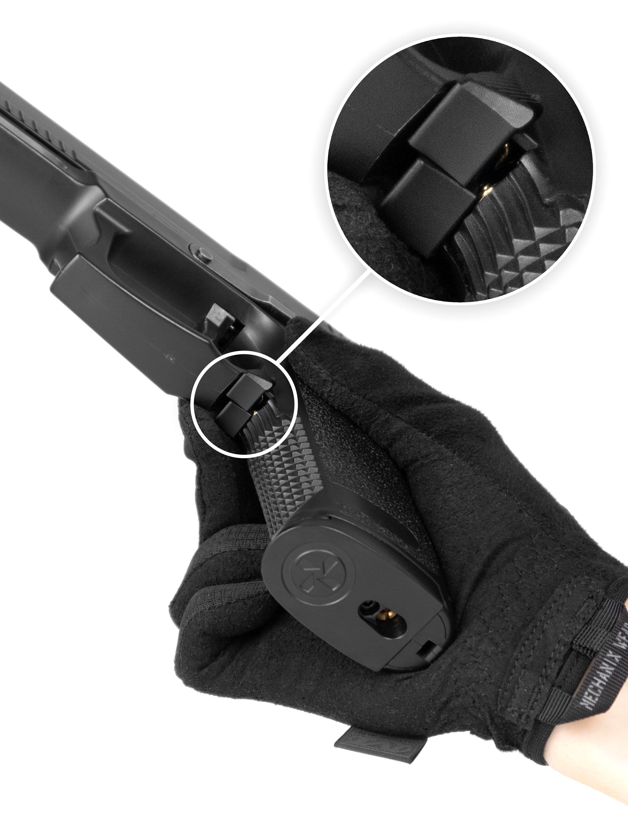 Prevent accidental magazine drops using upgraded SSX23 split mag release which requires both sides to be pulled at the same time to remove the magazine.