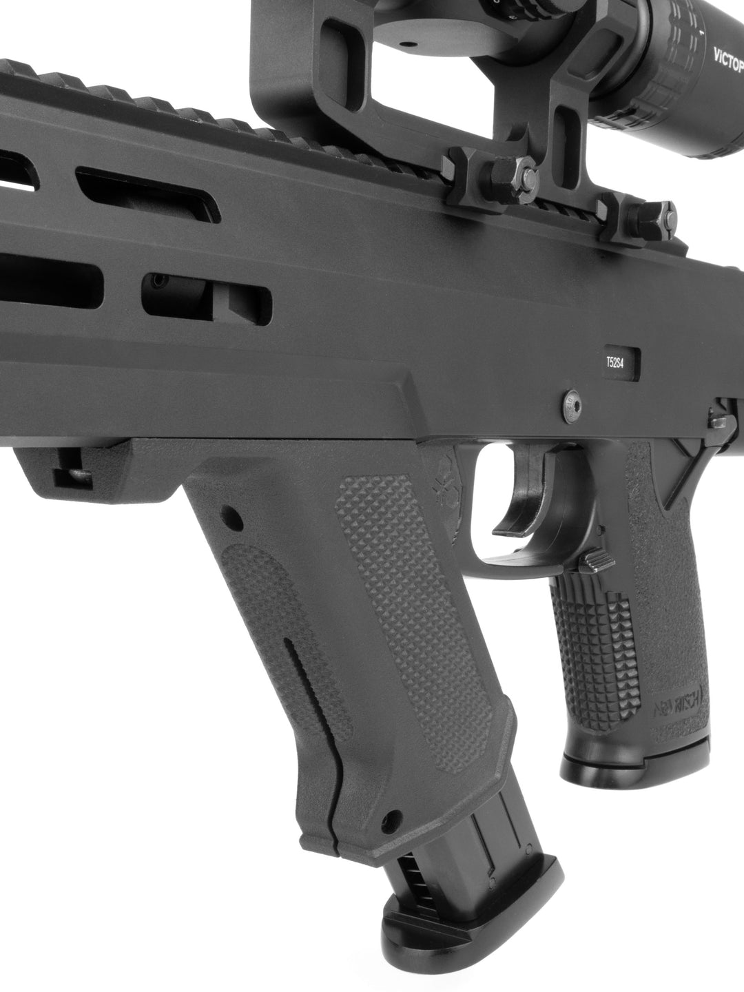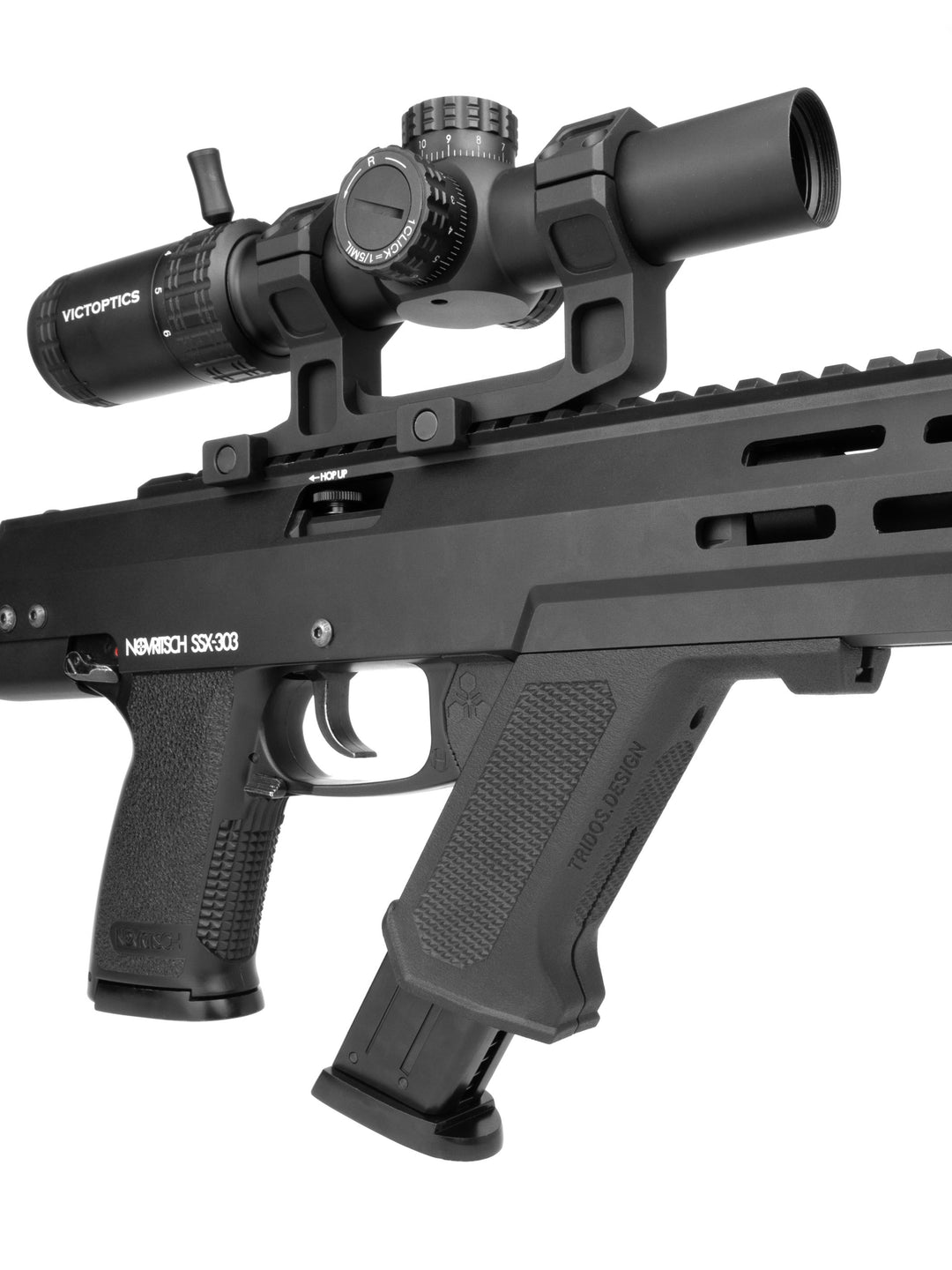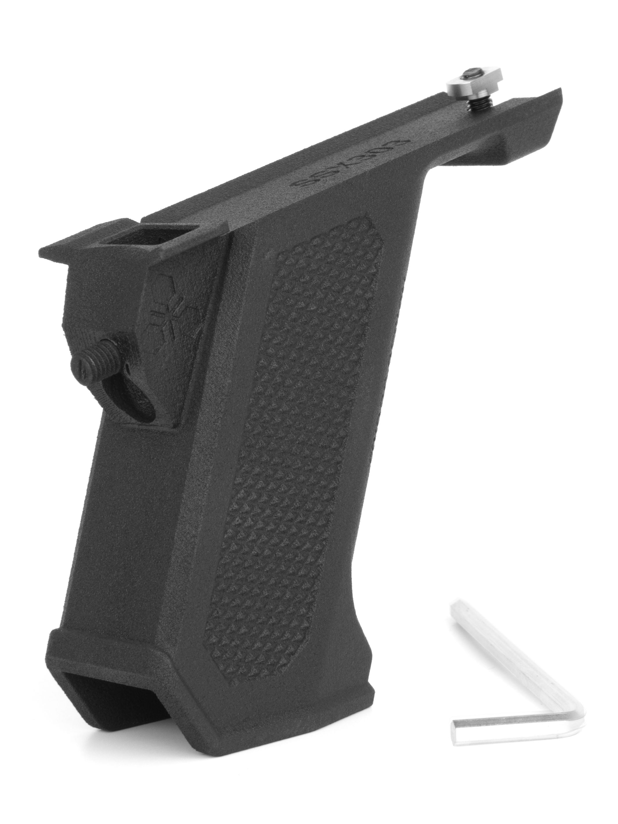 This is an angled grip for SSX303 that can hold a spare mag. It makes use of threads in the trigger guard and uses M-LOK to mount in the front.