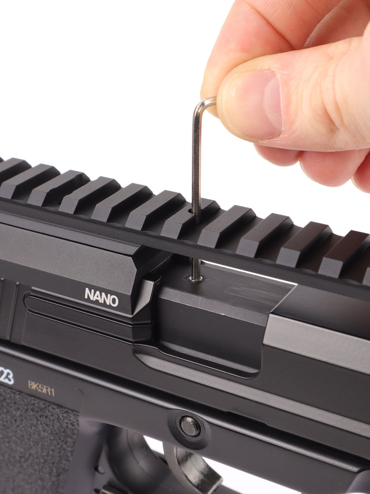 In the center you will find a cutout that's made for SSX23 TDC adjustment screw. Update: We made the cutout larger to accomodate all other MK23 TDC covers, like Hadron Design's 3-screw plate. Current and all future batches come with this change (pictures might not be fully up to date).