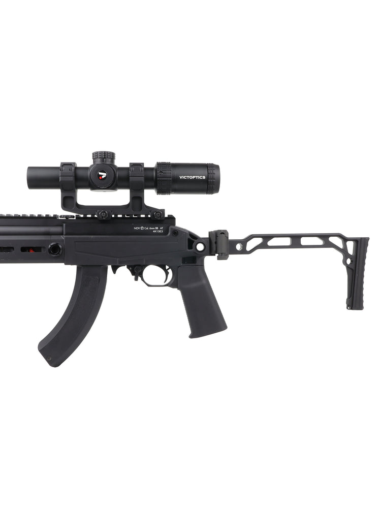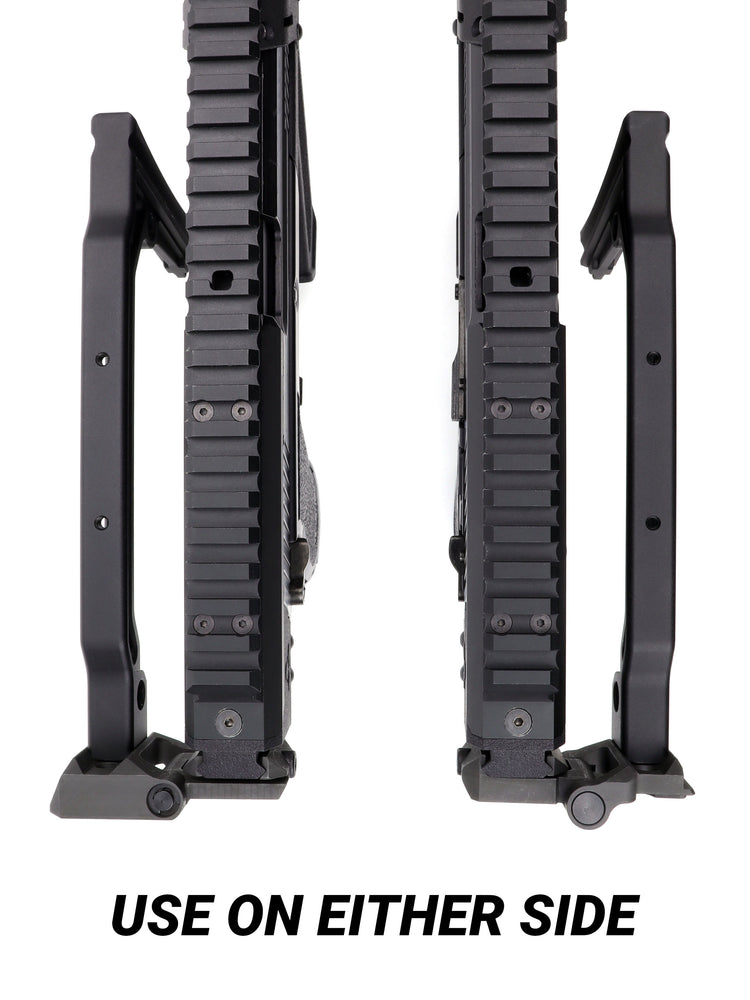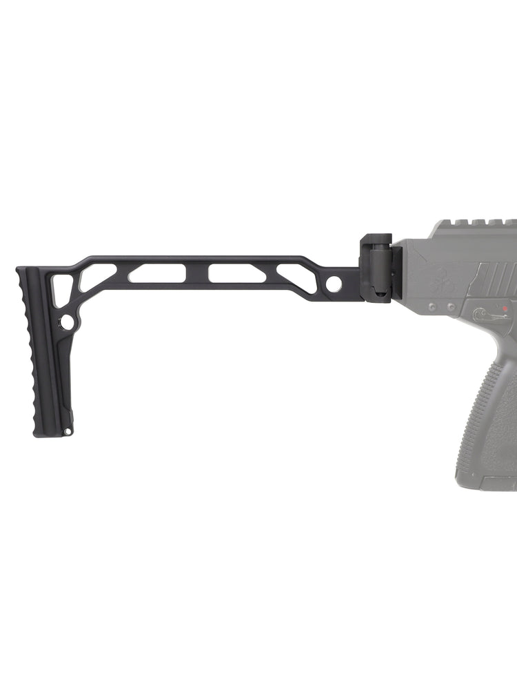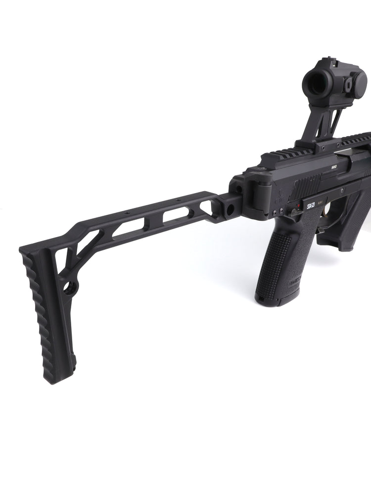 Minimalistic stock made out of metal. The folding mechanism can be flipped around making it possible to fold it to right side or left side.